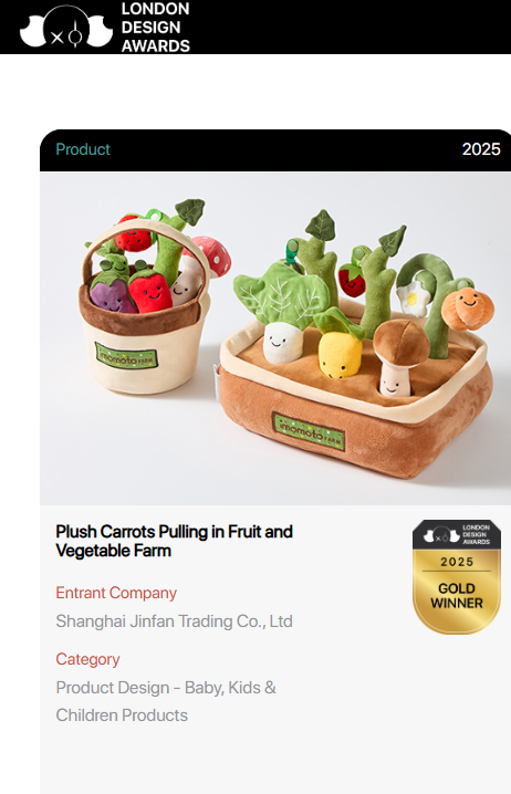 近日,欧盟婴童品牌imomoto旗下的拔萝卜玩具套装(Plush Carrots Pulling in Fruit and Vegetable Farm)凭借其卓越的设计理念与出色的品质,在众多参赛作品中脱颖而出,荣获2025年伦敦设计大奖金奖。这一殊荣不仅彰显了imomoto在母婴产品领域的创新实力,也为其品牌国际声誉的提升注入了强劲动力。