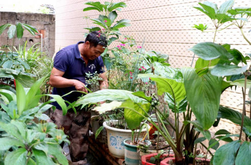 (云南省临沧市双江县邦丙乡忙安村农户正在整理院中的花草,2025年6月20日王明世摄)