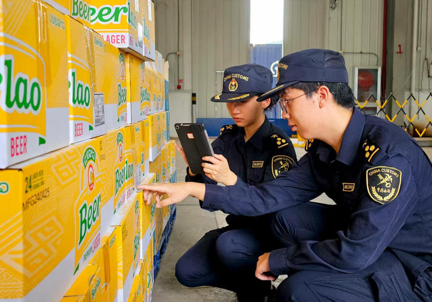 海关关员在磨憨铁路口岸对进口老挝啤酒进行查验  刘加文 摄