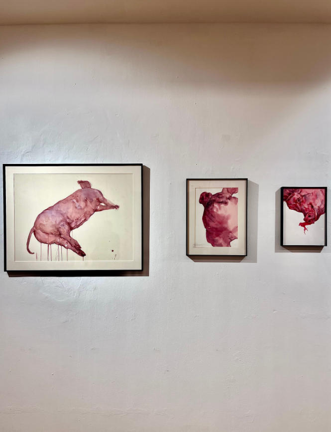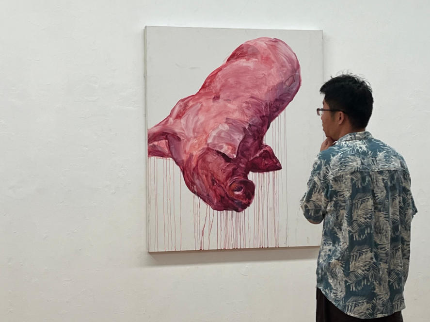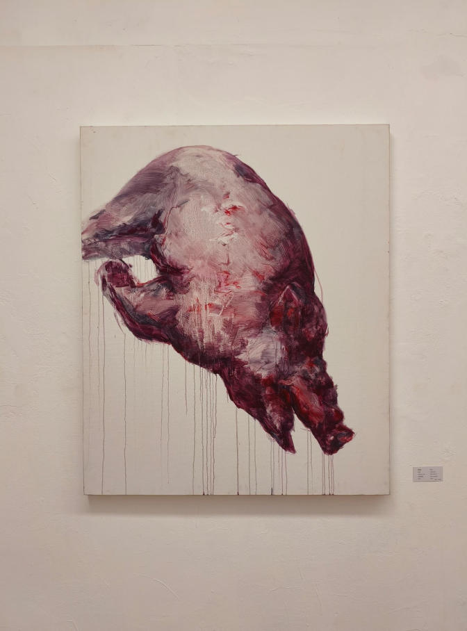 从王楚相关文字的表述中,能够了解到专注于肉身的描绘与共情,与她成长经历中的多次目击事件相关,也与她多年累积的人文哲思以及判断某种图像戏剧张力的直觉经验有关。不同于云南民间杀猪饭的热闹场景与氛围,王楚笔下被宰杀后的猪或是其他牲畜家禽,皆如重石一般砸在冷寂苍白的空间之中,且充满粘腻的质感与隐约的低沉哀鸣。