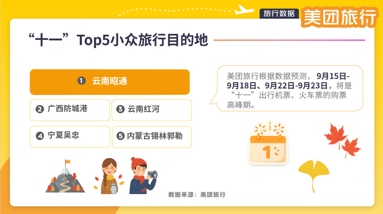 “上班上到不知天地为何物,现在规划‘十一’去哪玩还来得及吗?”热门目的地人挤人,反向出游也不失为“十一”旅行的好选择。美团旅行发布的《“十一”小众目的地指南》显示,热度居前的Top5小众旅行目的地分别为:云南昭通、广西防城港、云南红河、宁夏吴忠、内蒙古锡林郭勒。