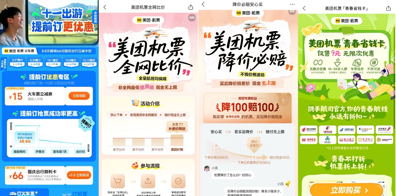 ▲美团旅行上线“十一出游提前订”“青春省钱卡”“全网比价”“降价必赔”等活动和权益 美团供图