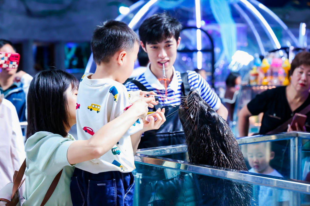 国庆期间,游客还可与4头聪慧的海豚在10余米长的展缸前进行趣味赛跑,抓拍同框的灵动瞬间,观看海狮在专属“运动会”上展示绝技。漫步于热带雨林区,游客不仅能体验色彩斑斓的雀鸟落于掌心,还能亲手触摸温顺的“水中绅士”水豚,或与“嘤嘤怪”小爪水獭握手——它们常会好奇地伸出小巧灵活的爪子与游客握手,湿湿凉凉的有趣触感与机灵的神态,定会成为旅程中难忘的回忆。此外,更有环尾狐猴比心互动,狐獴、小浣熊、鹈鹕等众多萌宠等待与游客见面。