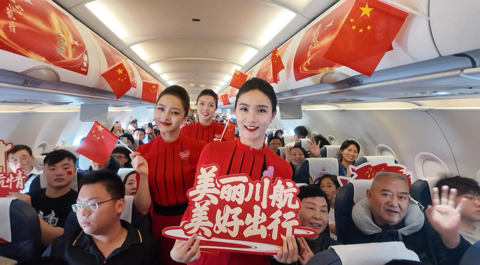 为庆祝新中国成立76周年,川航云南分公司开展“中国心 川航情”国庆主题航班活动,在万米高空中与旅客携手共庆佳节,让飞行旅程满溢节日温情。