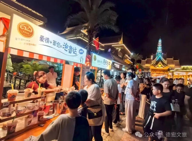 走进德宏,街头烟火气十足。游客们或排队品尝加20多种调料的早点,或猛吸一口冰凉爽口的泡鲁达,或津津有味地吃着撒苤,还有人享受缅式按摩洗头,咖啡店的香气也吸引着众人。不少游客的行李箱里,满载德宏咖啡、德昂酸茶、石斛鲜花饼、遮放贡米及多样文创产品。