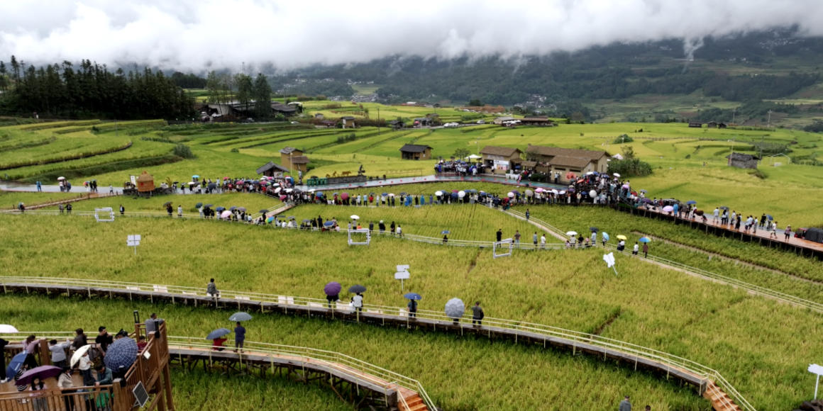最热闹的当属龙江乡。作为“2025中国美丽乡村休闲旅游行”精品线路核心区,这里的稻田与茶园成了游客的“欢乐场”。稻田公园内,稻浪翻滚,稻花鱼诱人,游客们挽着裤脚下田捉鱼,此起彼伏的笑声,成了田间最鲜活的风景。“今天雨不大,看他们捉鱼很有意思,我们也要试试。”游客岳子豪、呼子彦挤在围观人群中,满是心动:“到时候把自己亲手捉的鱼带去农家乐加工,从‘田间’到‘舌尖’,那真是新鲜。”