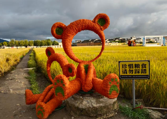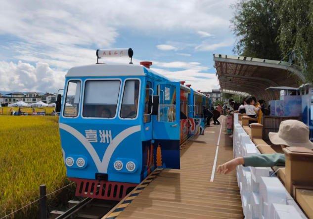 在喜洲镇金色稻田之间,巨型稻草猫巴士、黄牛与劳作扎像相映成趣,一列烈穿梭于稻田中的小火车成为社交媒体顶流焦点。大喜之洲公司通过“稻田+铁路”场景再造,将传统农耕区转化为沉浸式文旅空间。