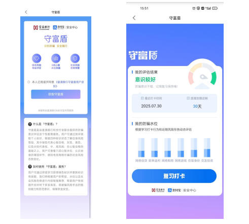 线上防护同样“不松懈”。手机银行“长辈版”专门嵌入“守富盾”防诈骗模块,以真实案例拆解、情景互动模拟的形式,精准提醒长辈警惕“保健品骗局”“冒充子女借钱”“虚假养老项目”等常见陷阱;同时,银行还建立了老年客户交易风险模型,对大额转账、向陌生账户汇款等异常交易实时预警,为老年客户的资金安全加上“双保险”。