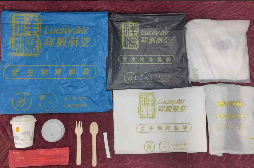 塑料污染是全球性挑战,机上塑料垃圾治理是民航绿色发展的重要课题。祥鹏航空积极响应国家号召及《民航行业塑料污染治理工作计划(2021-2025年)》,以客舱为“禁塑”重点,对机供品塑料制品分阶段精准减量。自2022年1月起,祥鹏航空在国内航线全面实施“禁塑”措施。一次性环保餐具包、纸杯、杯盖、手提袋、垃圾袋、毛巾袋、耳机等可降解环保产品全面取代了传统塑料制品,截至目前,已累计替换使用量约1980万件。