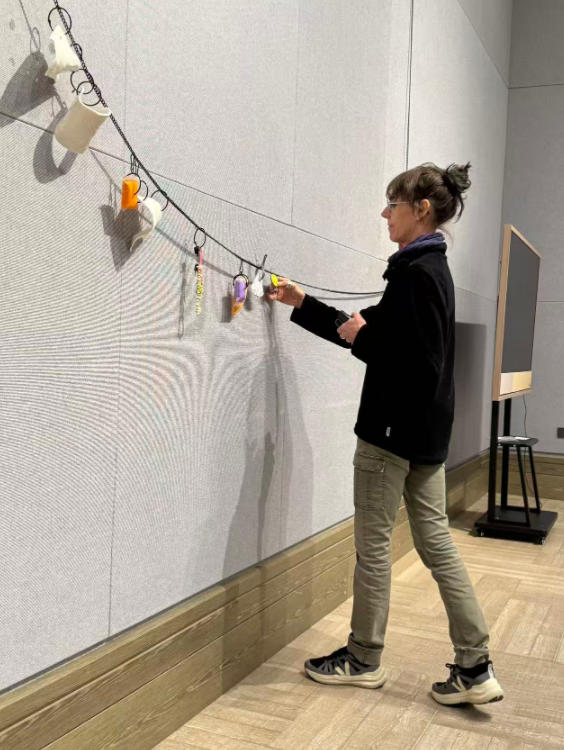 本次展览中,她特别在现场创作了一件大型墙饰,悬挂于空间之中,编织起巴黎(她的出发地)、景德镇(她于2025年秋季驻留之地)与昆明(作品的目的地)之间的联系。《墙上之饰》强调作品所占据的空间,提前标记其归属,仿佛是对场所的未来记忆,是一种空间取代身体的转移。在展览期间,它化身为游牧的身份与多重记忆的承载者,空间、墙壁及其组成的元素,因而成为不同概念投射的场域: 首饰在其中成为更大文化流动网络中的一个节点。