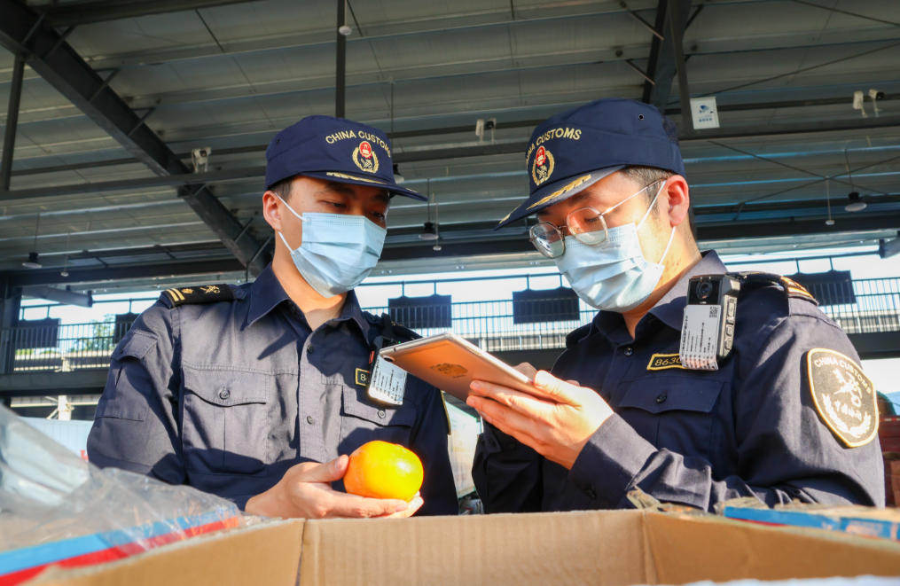 海关关员在河口公路口岸北山国际货场对出口柿子开展查验  邬蕊馨  摄