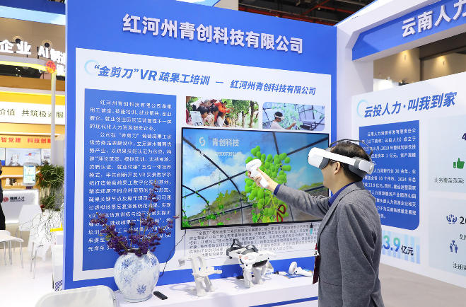 红河青创科技自主研发“金剪刀”VR葡萄疏花疏果实景教学系统,基于虚拟现实技术打造互动性强、真实感高的沉浸式技能培训环境,展现了科技赋能人才培养的前沿应用。