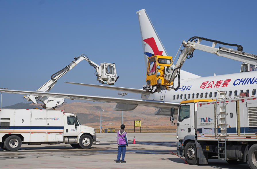 演练开始,昆明机场迅速启动大面积航班延误应急处置三级响应,按照预案对预警研判、联动会商、响应处置等工作做出统一部署。各单位各司其职,按照预案和部署开展工作。飞行区管理部共出动50人,出动除冰雪作业车、防冻液洒布车9辆,模拟使用除冰液35吨,重点对跑道、滑行道、巡场道除冰作业、防冻液撒布作业等进行演练。场区管理部出动60人,出动除冰车6辆,模拟使用除冰液2吨,重点对昆明机场南工作区道路除防冰作业、道路标识标牌摆放以及指引等进行了演练。航站区管理部重点对滞留旅客的指引与安置,以及协助航空公司为滞留旅客提供餐食、住宿和机票“退改签”服务进行了演练。医疗急救部人员演练了对身体不适的旅客进行现场医疗救助。