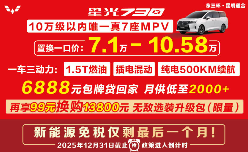 为了感恩回馈新老客户的支持,五菱汽车昆明通合总店推出超低首付6888元包牌、月供低至2000+的金融按揭方案,另外再享99元换购13800元限量选装升级包,数量有限,抓住福利。
