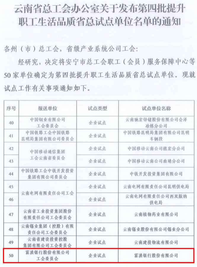 近日,富滇银行成功入选云南省总工会“提升职工生活品质试点”单位,成功获评“幸福企业”,标志着我行在构建和谐劳动关系、提升职工幸福感的道路上又迈出了坚实的一步。