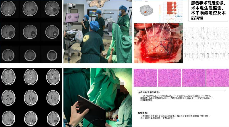 經院內多學科專家會診和充分評估討論,最終確定「術中喚醒麻醉結合神經電生理監測」的手術方案。手術中,麻醉科團隊在主任邵建林的指導下孫翔麻醉團隊精準調控麻醉深度,在關鍵環節喚醒患者;神經電生理戚仁莉,王為主任團隊與護理團隊緊密協作,在患者清醒的狀態下,引導其進行古詩背誦、物體命名、交流、肢體完成指令動作等任務,利用32導皮層柵格電極高頻腦電技術,解碼並定位運動功能區和語言功能區的精準範圍,清晰劃定安全切除邊界;李經輝以此為依據,實施精準顯微手術,最大程度切除腫瘤並完整保護了腦功能區域。術後病理診斷為星形膠質細胞瘤(WHO Ⅱ級),屬低級別膠質瘤。患者術後恢復良好,無語言、運動、感覺等神經功能障礙,已順利出院。