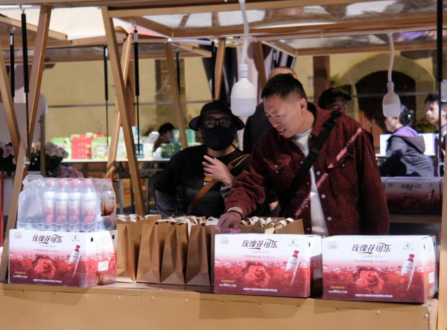 市集重磅引入两大云南特色名片,成为现场必买必体验爆款:一是云南首条玫瑰花可乐生产线产品亮相市集。该生产线于红河州蒙自市期路白苗族乡投产,采用NFC非浓缩还原果汁气泡水技术,最大程度保留玫瑰天然风味与营养,零添加、口感清新,时产1.2万瓶,年产值超千万元,真正把云南玫瑰酿成“共富蜜”。玫瑰花可乐颜值与口感兼备,成为市民游客打卡尝鲜首选。二是“丽江的花”雪山鲜切玫瑰,源自丽江现代花卉产业园,是总书记考察点赞的 “美丽产业”“幸福产业”,雪山融水滋养,花头大、花瓣厚、花期长,包含白雪山、洛神、弗洛伊德、娜欧蜜等热门品种,清新淡雅、治愈浪漫。“丽江的花”坚持“每一枝花都属于丽江,也属于你”,把丽江的诗意与浪漫带给大家。